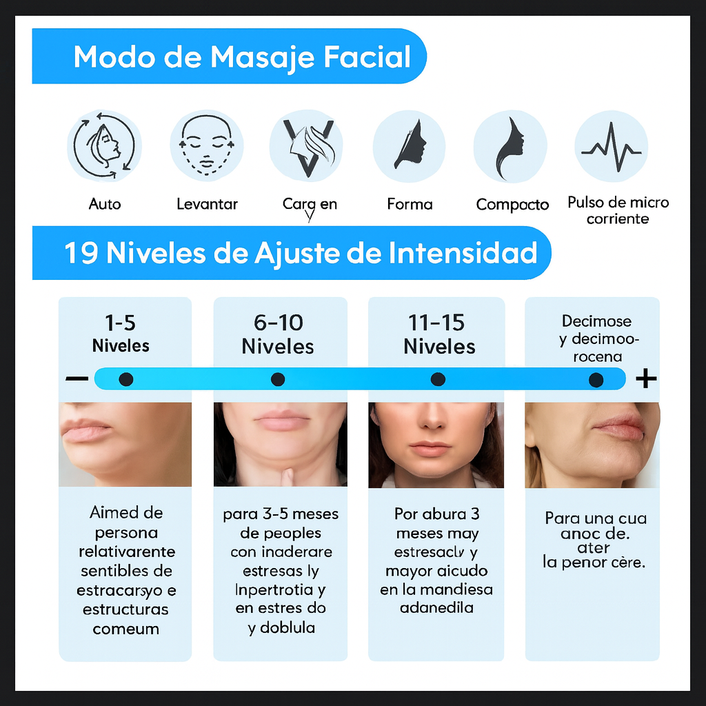 Con 8 modos y 19 niveles de intensidad, esta herramienta de ajuste facial satisface diversas necesidades de la piel.Una sesión de 15 minutos equivale a 200 masajes faciales, brindando beneficios personalizados para el cuidado de la piel.